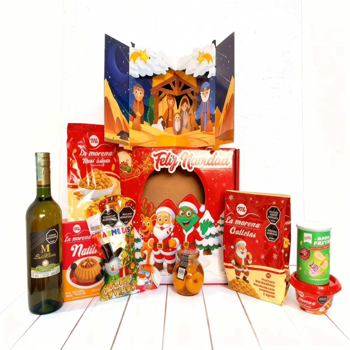 La Ancheta Pesebre Navideño es el detalle perfecto para decir “gracias” en Navidad sin complicarte. En una hermosa presentación temática, reúne todo lo que hace especial esta temporada: una botella de vino de manzana para brindar, galletas, natilla, masmelos, maní salado, papas fritas tipo snack, duraznos en almíbar y un delicioso tarro de arequipe para compartir en familia.