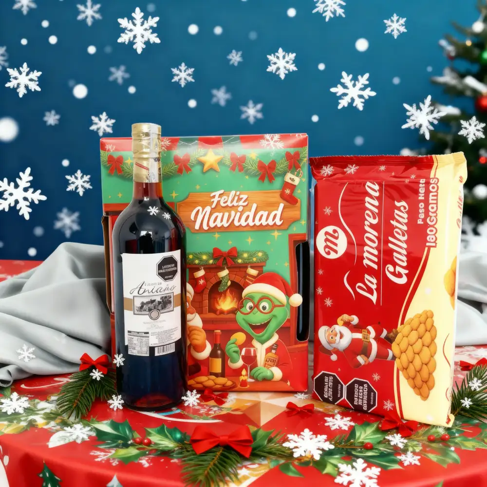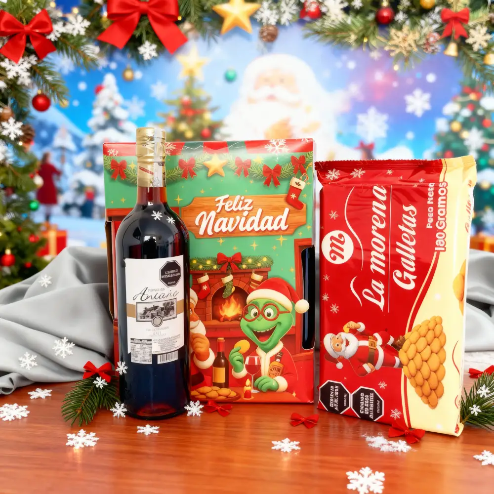 La Caja Duo Brindis Navideño es el regalo ideal para celebrar la temporada. Incluye una botella de vino tinto y una caja de galletas surtidas La Morena de 180 g, todo dentro de una caja decorada con motivos festivos. Es perfecta como detalle empresarial o regalo familiar gracias a su combinación equilibrada entre elegancia y sabor. Un obsequio práctico, atractivo y lleno de espíritu navideño que encantará a quien lo reciba.