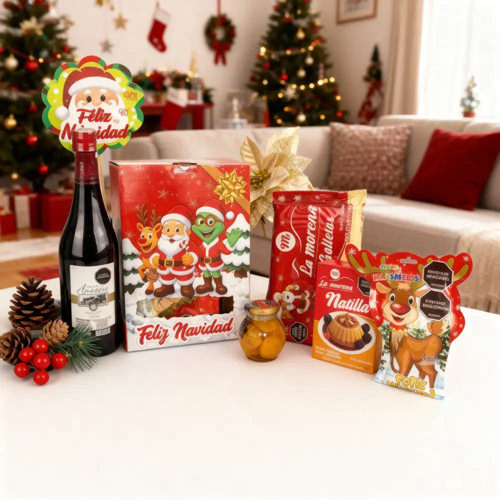 La Caja Mágia de Navidad es una ancheta navideña decorada con motivos festivos que incluye galletas La Morena, masmelos, natilla para preparar, duraznos en almíbar y una botella de vino. Es el regalo perfecto para empresas, amigos y familias que desean compartir un detalle lleno de tradición, sabor y alegría. Su presentación vistosa y su contenido equilibrado la convierten en un obsequio especial que encanta a cualquiera en esta temporada.